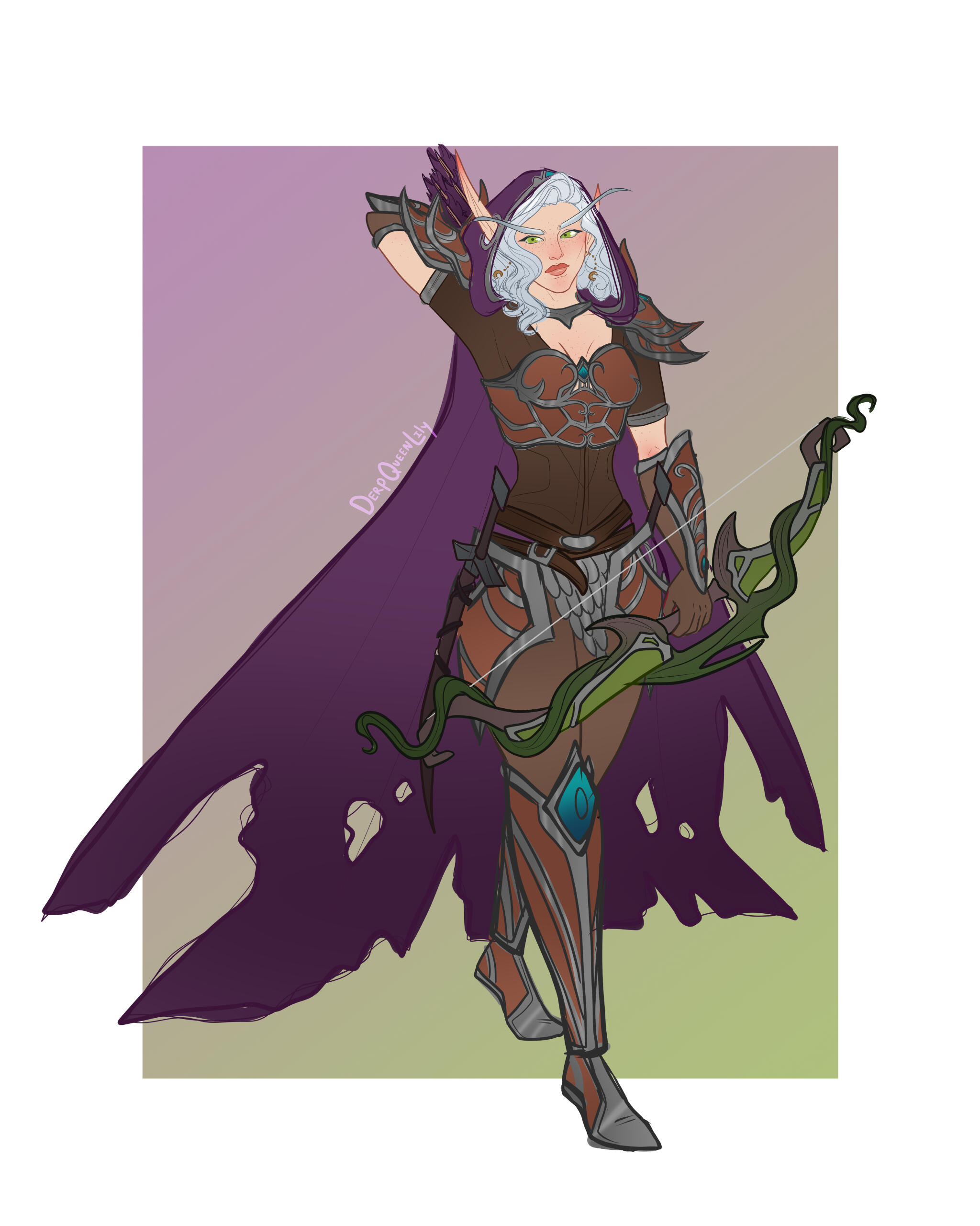 Erilihn was born to a commoner family in Windrunner Village, and from a young age she was raised to highly value the legacy of the Windrunner rangers. They were her role models growing up, and her ability with a bow stemmed from her burning desire to follow in the footsteps of these elven heroes.As soon as she was old enough to learn how to shoot an arrow, it was all she devoted her free time to. They found great comfort in the natural world around them, and they wanted nothing more than to join the Farstriders and surround themself with that world.Her parents had different aspirations, however; they wanted her to become an arcanist, and they believed her inquisitive mind to make her a perfect candidate. There was no excess of money in her household, but her parents managed to scrape together enough funds to send her to school in Silvermoon City, so that she could train among the Magisters. This did not last very long, as Erilihn had sensory issues with the feeling of arcane magic use. Not wanting to devote their life to the path of the mage, and finding that the people which surrounded her there were not to her taste, she dropped out as a teenager and returned to Windrunner Village, much to the consternation of her parents.Due to personal disagreements with her family, she left home shortly thereafter and became a Farstrider. Her youthful disobedience and loud mouth earned her the punishment of being stationed in the southernmost reaches of Quel'Thalas, watching over Thas'alah. This was intended to teach her a lesson of respect, and it served its purpose; she quickly became quite devoted to the mother tree, and she began to study nature magic alongside the druids who tended to the grove. The position taught her patience and reverence for her people's history and for the land around her. As a result of her refusal to rely upon the arcane and her preference for living off of nature above all, her addiction to magic was greatly lessened, as was the case with many of her Farstrider brethren. Consequently, her withdrawal symptoms were mercifully negligible. It did not take long for her to adjust to the loss of the Sunwell, at least in comparison to most of her kin.